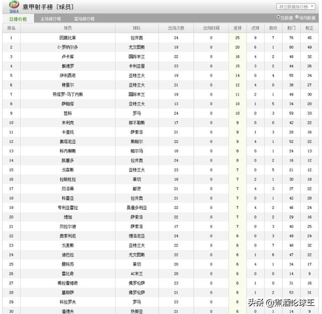 C罗本赛季25场意甲比赛出场21次,打进20球,贡献1次助攻,场均1.1粒进球,场均射门4.2次,射正2.6次,射正率为62%,目前射手排名第2位,欧冠出场6次,收获2粒进球!