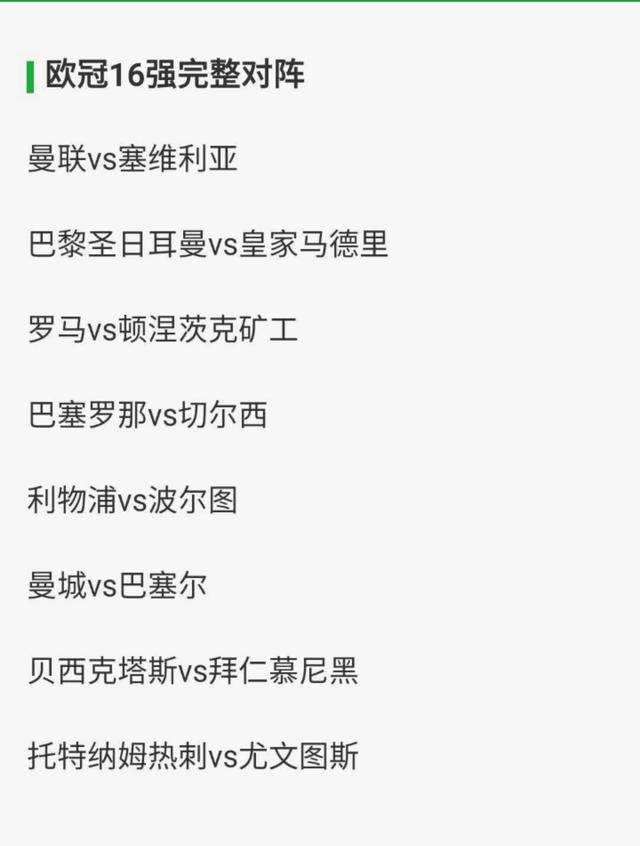这次八强的预测,还真是不好猜。依个人想法猜一个。八强分别是:曼联、巴黎圣日耳曼、罗马、巴塞罗那、利物浦、拜仁、曼城、尤文图斯。