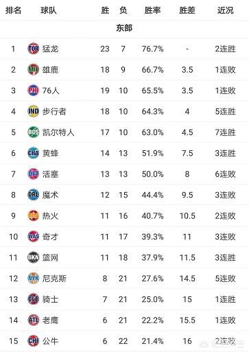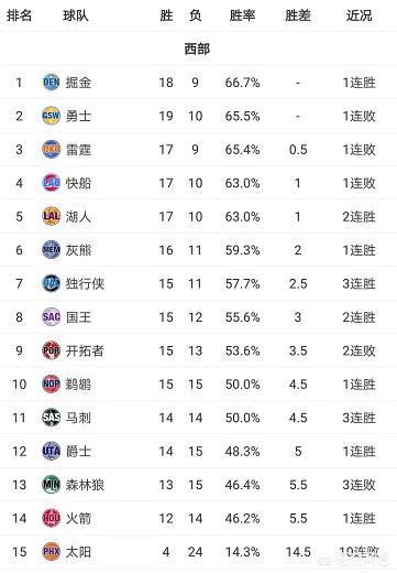 先来看看西部的战况!第一名掘金与倒数第二的火箭也就有6个胜场差距!而掘金到第五名的湖人也就1个胜场,所以像雷霆这样输一场球,就掉西部第三的现象也就不足为过了!而在赛季初期以10胜3负的开局战绩占据西部第一的开拓者队,由于随后的战绩不佳,也瞬间跌落神坛,占据西部第九!