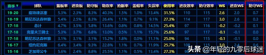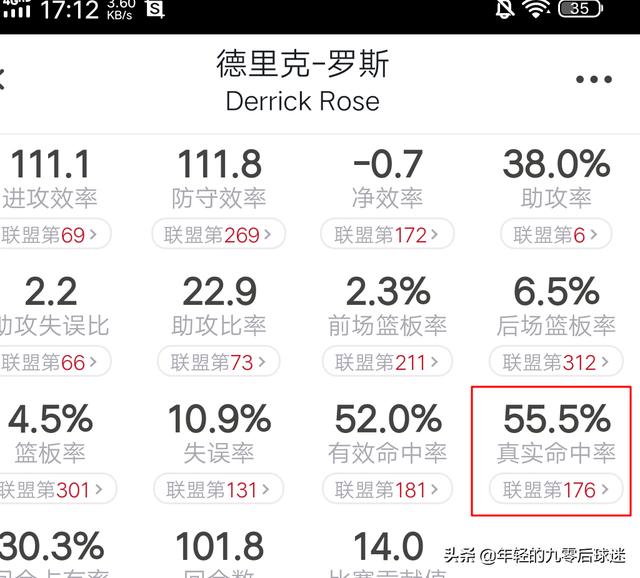 中距离出手数占比达到了30%,内线出手达到了50%,场均内线得到联盟第26名的10.3分,说明罗斯的内线进攻技巧还在,但是罗斯的内线杀伤能力却非常差,场均只能得到2.8次罚篮,如此高的篮下出手数却只能得到2.8次罚球,只能说明罗斯的内线冲击力已经严重下降。更严重的是罗斯的三分球命中率只有30.6%,和字母哥处在同一水平上,如此低的命中率根本不能提供稳定的外线火力,这在小球时代是不忍受的,除非你是字母哥,拥有联盟最顶级的内线冲击力。所以,就出现了这样的一个尴尬的结果,罗斯的整体投篮命中率是联盟35的49%,但是真实命中率确实联盟176名的55.5%,这就是为什么罗斯打得这么好,却无法带领活塞赢球的原因。
