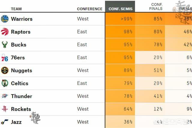 北京时间4月12日,专业预测网站《fivethirtyeight》对18-19赛季的季后赛概率做出预测,在他们预测中勇士队突破首轮的概率超过99%、猛龙队概率为98%、雄鹿队为95%、76人队为95%、掘金队为89%、凯尔特人队为79%、雷霆队为78%、火箭队为64%、爵士队为36%,季后赛次轮比赛里只会有8支球队,火箭队恰好就在这份预测中排在第八位、爵士队在第九位,爵士队是本季季后赛首轮里以下克上可能性仅次于雷霆队的存在,如果火箭队不是在关键输给了雷霆队,那么现在火箭队估计也能在《fivethirtyeight》预测拿到接近90%的晋级次轮的概率...