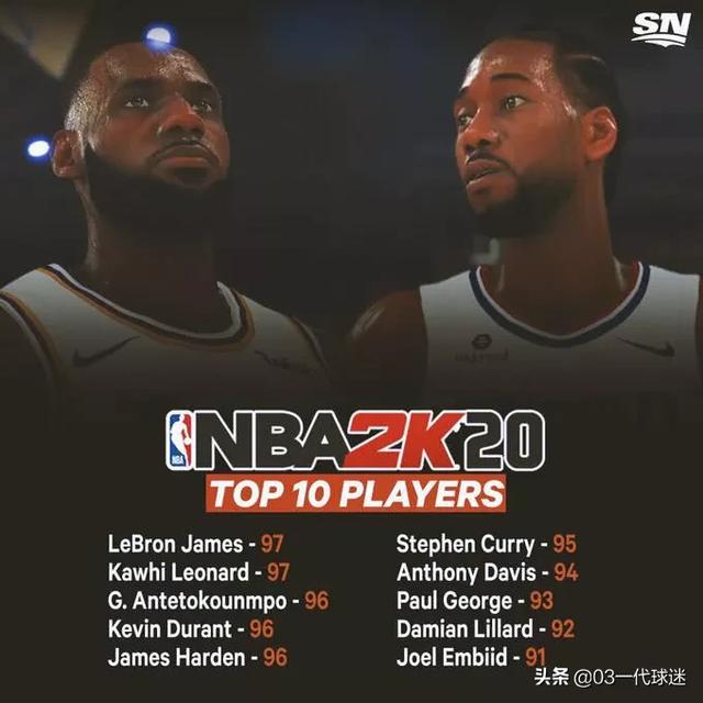 今天NBA 2K官方在推特直播公布了下个赛季Top2球员的能力值。詹姆斯和莱昂纳德分别以97分位列一二位,字母哥、杜兰特、哈登96分,排名三、四、五,库里95分排在第六,浓眉94,乔治93,利拉德92……