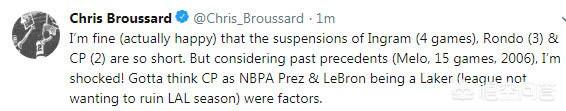 ★★从这个处罚的力度来看的话,其实联盟算是对湖人的英格拉姆与隆多网开一面了。此前我在预测处罚结果的时候,英格拉姆肯定是最为严重的,但是我并没有想到这个年轻气盛的小伙子竟然只禁赛了4场,这确实有点出乎我的意料。要知道英格拉姆是整个事件最主要的冲突者,他的几个行为非常令人失望。